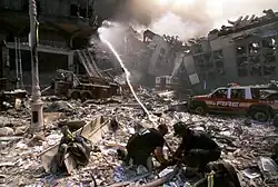 During the September 11 attacks, the company reported to the North Tower of the World Trade Center.[2] As the time of the attacks coincided with the morning tour change, both tours remained on duty, and the company arrived at the World Trade Center carrying more men than usual. Captain Patrick J. Brown and his men were last known to be on the 35th floor of the tower before the North Tower collapsed. Ladder Company 3 received some of the heaviest casualties of any fire company in the FDNY.[3]