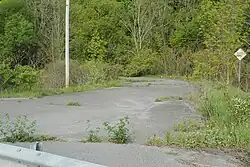 NY 30 has been realigned in two areas along its routing. The first realignment was in the Schoharie Valley near the hamlets of Breakabeen and Fultonham. NY 30 was originally routed along the base of Toepath Mountain near Fultonham and along a pair of village streets in Breakabeen. In the 1950s, a proposal was made to reroute NY 30 onto a new routing in the base of the valley surrounding Schoharie Creek. The proposal was approved, and the new alignment of NY 30 opened c. 1970.[15][16] The former routing of NY 30 from Max V. Shaul State Park near Breakabeen to Fultonham, still visible from the modern alignment of the route, was closed to the public and guardrails were installed to stop motor traffic from using the route. However, biking and walking was still allowed, and the old highway is now a 1.5-mile-long (2.4 km) trail known as "Old Route 30". The trail is not maintained; thus, the quality of the blacktop along Old Route 30 has deteriorated over the years. There are significant potholes and overhanging trees, but the path is still traversable. A large landslide has taken out a section of the road at the southern end.