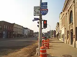 Across the county line, NY 36 enters the town of North Dansville and the village of Dansville located within. At the southern village line, NY 36 meets the southbound entrance and exit ramps for I-390 at exit 4 and gains the name Clara Barton Street. Due to the angle at which I-390 crosses NY 36 here, the northbound entrance and exit ramps are located another 0.5 miles (0.8 km) to the north. The route follows Clara Barton Street north into the village center, where it gradually curves northeastward ahead of a junction with Main Street (NY 63) in Dansville's business district. NY 36 turns northwest here, following NY 63 along Main Street for two blocks before returning west on Ossian Street. The highway turns again just six blocks later to follow Dock and Franklin streets northwest toward Dansville Municipal Airport. Ossian Street, meanwhile, continues west as NY 436, which passes under I-390 a short distance to the west.[5]