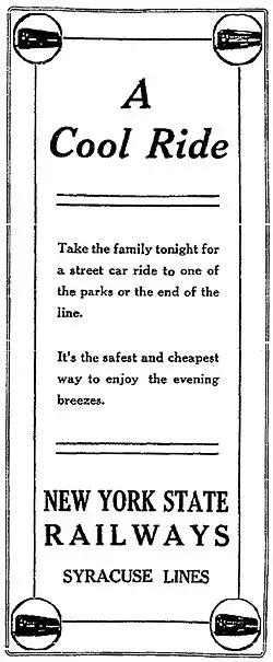At its peak, New York State Railways operated 338 miles across Rochester, Syracuse, Utica, Oneida, Sodus Bay, Canandaigua, and Geneva. In June 1920, the total value of the New York State Railway Corporation franchise in Syracuse as determined by the New York State Tax Commission was $2,320,000 down from $2,407,000 in 1919.[3]