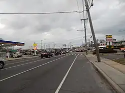 After Peninsula Boulevard, NY 102 continues eastward along Front Street,[5] which becomes state-maintained at a junction with William Street.[6] The route winds eastward through Hempstead for several blocks along the now four-lane road, passing numerous residences and apartment buildings. NY 102 bends northeast, intersecting with Uniondale Avenue in Uniondale. At this junction, the route becomes commercial in nature once again, crossing several blocks of businesses until Locust Avenue. Now two lanes, NY 102 continues northeast through Uniondale, crossing under the six lanes of the Meadowbrook State Parkway (with no interchange present). After the Meadowbrook, the route continues to bend northeast, passing through more residences and large commercial strips. A short distance later, the route intersects with Merrick Avenue, entering the Barnum Woods section of East Meadow.[5] In Barnum Woods, NY 102 becomes a mix of residential and commercial as the two-lane main street. At the junction with Vincent Road, NY 102 leaves Barnum Woods and enters East Meadow.The route remains commercial and residential in nature, proceeding northeast past a long strip mall near East Meadow Avenue. After passing a large complex of stores, NY 102 intersects with NY 24 (Hempstead Turnpike) once again in East Meadow. This T-intersection serves as the eastern terminus of NY 102, whose right-of-way also ends.[5]
