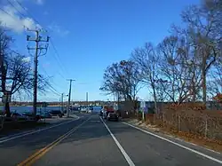 After several miles, NY 114 finds itself in the village of Sag Harbor. This colonial whaling port is today a village of boutiques and shops along the waterfront of Sag Harbor Bay, an arm of Peconic Bay. NY 114 makes several turns as it navigates the village's centuries-old street pattern.[6] Just before crossing the Sag Harbor Cove, the road meets the northern terminus of the village's Main Street, an extension of County Route 79 which leads south to Bridgehampton.[4]