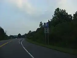 NY 169 begins a short distance north of New York State Thruway (I-90) exit 29A at an intersection with NY 5S in the town of Danube. It initially heads northward, paralleling a north–south roadway leading away from the exit that overpasses NY 5S. The two roads converge after 0.37 miles (0.60 km), directly connecting NY 169 to the Thruway.[1] NY 169 continues on a northward course to just south of the Mohawk River, where it turns to the northwest and subsequently follows the river, through a wooded area that leads toward the city of Little Falls.[3]