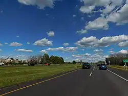 After re-crossing into Hamburg, NY 179 continues eastward as Milestrip Road, entering a large interchange with the New York State Thruway (I-90 exit 56), which connects via trumpet interchange. After bending northeast, the route crosses over the Thruway, passing north and south of several strip malls until an intersection with CR 204 (McKinley Parkway). After CR 204, NY 179 passes north of McKinley Mall, proceeding eastward as a four-lane undivided expressway past several residences before bending northeast, intersecting with CR 4 (Abbott Road) in the town of Orchard Park.[4]