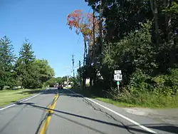 Past NY 32, NY 196 bends southeast through Kingsbury as a two-lane residential road. Crossing over a tributary of the Glens Falls Feeder Canal, the route crosses a single-track railroad line before crossing over the Champlain Canal on a large truss bridge. After the Champlain Canal, NY 196 bends northeast through Kingsbury, crossing an intersection with the northern terminus of CR 42, soon leaving the residential section for a more rural area of town. Passing numerous farms, NY 196 soon bends eastward, crossing an intersection with CR 43. NY 196 bends northeast on a sharp curve, leaving Kingsbury for the town of Hartford. The route winds past numerous homes, turning north past a couple farms before following a gradual bend east near Slate Way.[3]