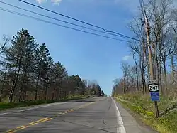 NY 247 begins at an intersection with NY 364 in a creek valley northwest of the hamlet of Potter. While NY 364 runs east–west across the base of the valley, NY 247 heads to the northwest, paralleling NY 364 for 150 yards (137 m) as it gradually climbs the northern side of the gully. After reaching the top of the valley, NY 247 curves to the north and begins the north–south alignment that most of the remainder of the route follows.[3][4] Continuing north, it traverses 2.5 miles (4.0 km) of open farmland on its way to the village of Rushville, located in both Yates and Ontario counties. NY 247 follows South Main Street through the Yates County portion of the village to Rushville's central business district, where it meets NY 245 at Gilbert Street. NY 245 joins NY 247 here, and both routes follow North Main Street into Ontario County.[4]