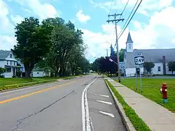 At the intersection with Versailles Plank Road, NY 249 proceeds northeast, turning east on Brant Road a short distance later, while Versailles Plank Road continues north as CR 41. NY 249 continues eastward along Brant Road, a two-lane farm road, intersecting with CR 546 (Mileblock Road). The route crosses over Big Sister Creek and becomes residential as it enters the village of North Collins, located in the town of the same name. In North Collins, NY 249 becomes Brant Street, a two-lane village street, intersecting with US 62 (Main Street). At this junction, NY 249 leaves Brant Street for Sherman Avenue, crossing multiple residences and over the former Erie Railroad's Buffalo and Southwestern Railroad. At the junction with High Street, NY 249 runs south for a block on High Street, intersecting with Thiel Road, which NY 249 leaves the village of North Collins on.[3] Thiel Road and NY 249 wind southeast as a two-lane residential road, soon intersecting with Langford Road, where NY 249 turns off Thiel into the town of North Collins. The route crosses through a rural section of North Collins, intersecting with CR 501 (Ketchum Road). After CR 501, NY 249 continues eastward on Langford Road, intersecting with CR 486 and CR 487 (Jennings Road). The route crosses over a brook and remains going eastward as it enters the hamlet of Langford. In Langford, NY 249 passes several residences before intersecting with NY 75 (Sisson Highway). This intersection serves as the eastern terminus of NY 249, whose right-of-way continues east as CR 39 (Langford Road) to the hamlet of New Oregon.[3]
