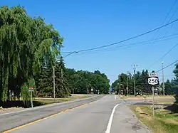 About 0.3 miles (0.5 km) later, the highway reenters a more populated area that delimits the southern edge of the village of Webster. Now South Avenue, NY 250 heads north through the densely populated southern half of the community, passing by Spry Middle School on its way into the village center. Once again, the homes are supplanted by businesses as NY 250 and NY 404 (Main Street) meet at the heart of the business district. North of the junction, the route changes names to North Avenue and connects to the Irondequoit–Wayne County Expressway (NY 104) at an interchange just two blocks from NY 404. It continues on, crossing the Ontario Midland Railroad before leaving the village and becoming Webster Road once more. The highway heads onward through mostly residential areas of northeastern Webster to Lake Road[3] (formerly part of NY 18),[4] where NY 250 ends 250 yards (230 m) from the Lake Ontario shoreline at Nine Mile Point.[3]