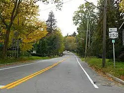 East of Winton Road, NY 252 narrows to two lanes and enters a highly residential neighborhood. At the Henrietta–Pittsford town line, the route passes the Locust Hill Country Club.[4] Past Locust Hill, NY 252 continues past a series of residential neighborhoods to an intersection with NY 65. East of NY 65, NY 252 becomes West Jefferson Road and briefly enters an area of open, cultivated fields before entering the village of Pittsford. The route heads east for four blocks as a residential street, passing Pittsford Sutherland High School before ending at an intersection with South Main Street (NY 64 and NY 96).[4]