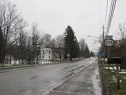 NY 275 begins at the intersection of Wellsville and Main streets in the village of Bolivar. At this point, NY 417 switches from South Main Street to Wellsville Street while NY 275 proceeds northeastward on the two-lane Main Street. The route initially passes by commercial buildings in the village's business district; however, they quickly give way to more residential areas after just two blocks. As the highway heads away from the village center, the homes become scattered ahead of intersections with the eastern terminus of County Route 5A (CR 5A, named Salt Rising Road) and the south end of CR 40 (Deans Flat Road). The rural trend soon reverses as NY 275 enters the adjacent village of Richburg. Here, NY 275 is also known as Main Street as it serves Richburg's business district and the surrounding residential neighborhoods.[3]