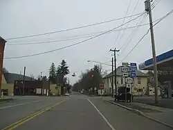 After the village of Avoca, NY 415 parallels I-390 northwestward through the Cohocton River valley to the hamlet of Bloomerville, where CR 6 intersects NY 415 from the southwest. From here, NY 415 meanders its way northward along the base of the valley, crossing the B&H main line, I-390, and the river to reach the small hamlet of Wallace, centered around NY 415's junctions with CR 105 (Henderson Street) and CR 9 (Twelve Mile Creek Road). Another rural stretch brings NY 415 into the town of Cohocton, where the route closely follows the eastern edge of the valley to serve the village of Cohocton. Within the village, NY 415 gains the South Main Street moniker and becomes a two-lane residential street. At Cohocton's central business district, NY 415 turns westward and becomes Maple Avenue. The former right-of-way along Main Street becomes NY 371, which heads northward along North Main Street.[5]