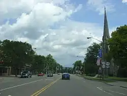 The route continues into the village, changing names from Coopers–Bath Road to East Morris Street. Just inside the village limits, NY 415 passes a long stretch of residences and a former railroad right-of-way. Near the center of Bath, the route veers off East Morris Street and onto East Steuben Street, a parallel street one block to the north serving more commercial areas of the village. After five blocks, NY 415 turns northward onto Liberty Street, which carries the route for another two village blocks to the downtown portion of the village. Here, NY 415 meets NY 54, which switches from West Washington Street to Liberty Street at this point. NY 415 turns west here, overlapping with NY 54 along West Washington Street, a two-lane street serving mixed-use areas. The concurrency ends in a commercial area on the village's west side, where NY 415 turns northward onto West Morris Street while NY 54 proceeds west to the Southern Tier Expressway's exit 38.[5]