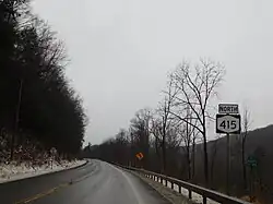 In Campbell, NY 415 runs through mostly wooded, rural areas, save for a handful of homes in hamlets along the route. In Curtis, located about 2 miles (3.2 km) from Coopers Plains, NY 415 connects to the eastern terminus of CR 4 (Curtis Hollow Road). The highway continues northward from Curtis, closely paralleling the Cohocton River for another 1.5 miles (2.4 km) to the hamlet of Campbell. NY 415 bypasses most of the community to the east; as a result, the route serves only a small number of homes on the outskirts of the community. As the highway heads through the area, it meets the east end of CR 333 (Main Street), which heads westward into Campbell's business district.[5] The junction with CR 333 was the former eastern terminus of NY 333,[6] a designation eliminated in 1997.[7] NY 415 continues northwest from this point, intersecting with CR 17 (McNutt Run Road) before leaving the hamlet for less developed areas of the town.[5]