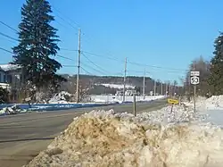 Over the next ten miles (16 km), the route traverses a series of small hamlets located in otherwise undeveloped and isolated areas of Steuben County. The gully leads NY 53 to the Wheeler–Prattsburgh town line, where the valley makes a sharp turn to follow the town line to the east. NY 53 continues due north into Prattsburgh, however, climbing the side of the valley to reach the hamlet of Prattsburgh. The route heads north–south through the western edge of the large community, following Main Street through its central business district. At Chapel Street, the commercial surroundings end and NY 53 turns to leave Prattsburgh to the northwest.[3]
