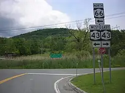 New York State Route 66 (NY 66) is a state highway in the Capital District of New York in the United States. The route begins at an intersection with US 9 and NY 23B in the Columbia County city of Hudson and ends at a junction with NY 2 in the Rensselaer County city of Troy. While both Hudson and Troy are located on the Hudson River, NY 66 follows a more inland routing between the two locations to serve several rural villages and hamlets, including Chatham and Sand Lake. NY 66 overlaps with U.S. Route 20 (US 20) and NY 43, two regionally important east–west highways, in Nassau and Sand Lake, respectively.