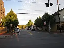 The route turns south at Cedar Street, following the residential street into downtown Akron. Here, NY 93 intersects with CR 573 (John Street)[3] at a junction that was once the western terminus of NY 267.[4] At this intersection, NY 93 heads west on John Street for one block before continuing south on Buffalo Street for another block to Main Street. NY 93 turns westward again, following Main Street through the westernmost part of Akron's central business district prior to curving southwestward at a junction with Mechanic Street. The highway takes on the Mechanic Street name as it crosses over Murder Creek and leaves downtown Akron. Just south of the creek, NY 93 changes names to Buell Street at an intersection with Jackson Street.[3]