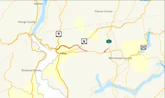 The Bear Mountain State Parkway (often referred to as the Bear Mountain Parkway) is a state parkway located in northern Westchester County, New York, in the United States. It is an incomplete highway, with a 3.85-mile (6.20 km) western section and a 0.73-mile (1.17 km) eastern section; both sections comprise New York State Route 987H (NY 987H), the unsigned reference route assigned to the road by the New York State Department of Transportation (NYSDOT). Crompond Road (US 202/NY 35) provides a connection between the two sections. Collectively, the parkway extends from an intersection with US 6, US 9, and US 202 southeast of the Bear Mountain Bridge to an interchange with the Taconic State Parkway in Yorktown.