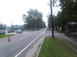 Within the historic district, NY 9P serves a number of stately Victorian homes built in the second half of the 19th and early 20th centuries, as well as buildings owned by Empire State College, some of which were once Skidmore College Buildings.[6] Union Avenue terminates at Circular Street, which abuts the eastern border of Congress Park. From here, NY 9P continues north on Circular Street before turning west on Spring Street a short distance after. The route continues along the north side of Congress Park for three blocks before ending at an intersection with US 9 and NY 50 (Broadway).[4]
