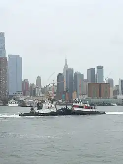 The New York Tugboat Race is a contest for working tugboats held on the Hudson River every Fall on the Sunday before Labor Day. It was founded in part by Captain Jerry Roberts, who also serves as its chief announcer.[1] Boats race one nautical mile from 79th Street to Pier 84 at 44th Street in Manhattan. The race is the occasion for a dockside festival.[1] Events currently include nose-to-nose pushing competitions, a line toss competition, and best mascot/costume contests between the crews.[2] After the award, the spectators of the race can compete in events that include a knot tying competition, an on land line toss competition and a spinach eating competition. The spinach eating competition is in honor of the Popeye the sailor cartoon character. Spectators can also pay to get a seat on a tug boat during the events.[3]