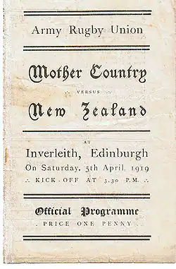 Llanelli's first official game after the War was against the New Zealand Army team from the Larkhill Garrison in Wiltshire. This was followed by games against the New Zealand Machine Gun Corps on 22 February 1919.[2] These and similar teams came together to make the New Zealand Army team. This team split into an 'A' and 'B' team when during a tour of Great Britain, an inter-services tournament, with a cup presented by King George V, was held between the allied forces.[3] The stronger New Zealand Army 'A' team took the challenge of the King's Cup and eventually triumphed over the British Army at Twickenham. The 'B' team continued the tour of Great Britain and France.