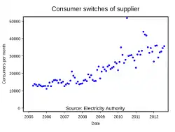 Retailers purchase electricity from the wholesale market, and on-sell it to consumers. Competition for retail customers varies across the country but since 1999, when full retail competition was introduced, customers have switched at a rate between 9% and 14% per annum.[7] Consumer NZ, with support from the Ministry of Consumer Affairs, provides a website called Powerswitch that enables consumers to compare electricity and gas prices from different retailers and to switch suppliers.[8]