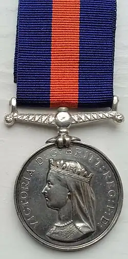 The medal was granted to Colonial Forces and Friendly natives who had "been actually under fire, or otherwise conspicuous for distinguished service in the field," and also to nearest relatives of anyone killed in action or who had died of his wounds.[4] Claims from Colonial forces were closed in 1900 but reopened in 1910 and 1913 in association with land claims for service in the war. Claims were finally closed for Europeans in 1915 and Māori in 1916.