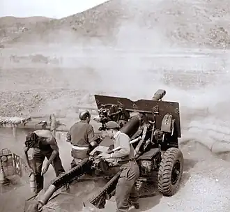 The force left Wellington on 10 December 1950, arriving at Pusan (modern day Busan) on New Year's Eve, joining the British 27th Infantry Brigade 21 January.[6] The New Zealanders immediately saw combat and spent the next two and a half years taking part in the operations (most notably the Battle of Kapyong and the First Battle of Maryang-san) which led the United Nations forces back to and over the 38th Parallel (with the NZ naval vessels being especially active in the inner Han River estuary), later recapturing Seoul in the process.[9]