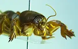 The mole cricket was well known to Māori, who encountered it when cultivating garden plots and called it honi.[2] Mole crickets collected in New Zealand were assumed to be the European species Gryllotalpa vulgaris (a synonym of Gryllotalpa gryllotalpa), which has a wingless nymph that resembles the adult New Zealand species.[3] Triamescaptor aotea was named and described by Norman Tindale in 1928 from two specimens collected in 1915 at Aramoho, Whanganui.[1] It is the only species in its genus, and the only genus in tribe Triamescaptorini.[4] Its closest relatives are two Australian species of Gryllotalpa.[5] Triamescaptor is sometimes incorrectly spelled "Trimescaptor" in later publications.[6]