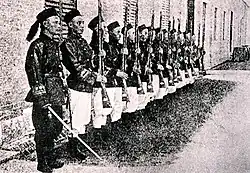 These functioned as the military police of the empire. One battalion was organised in 1908 consisting of 299 men and 82 horses.[37]