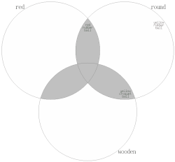 An alternative approach inspired by Carnap defines a natural kind to be a set whose members are more similar to each other than each non-member is to at least one member.[22][k] However, Goodman[23] argued, that this definition would make the set of all red round things, red wooden things, and round wooden things (cf. right picture) meet the proposed definition of a natural kind,[l] while "surely it is not what anyone means by a kind".[m][24]