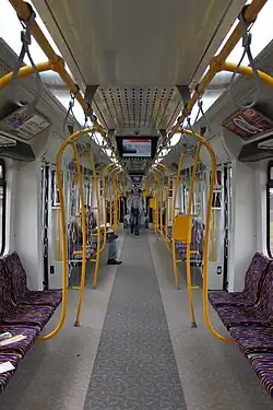 The seating arrangement (produced by Kiel)[1] is mixed – most seats are along the windows, while only in the end cars are they in a group arrangement. The aisle width in the passenger area is 800 mm. One of the end cars includes two positions for securing wheelchairs and a lift to assist wheelchair users in boarding.[1][12] The trains are equipped with air conditioning (produced by Thermoking), forced-air heating, passenger information systems, four bicycle racks, a passenger counting system, ticket machines, video monitoring, and advertising monitors.[1][2][27] The 19WE units do not have toilets[27] (these are planned for long-distance versions).[28]