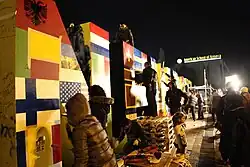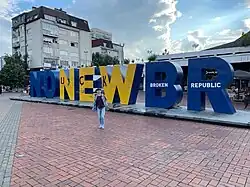 The Newborn Monument (NEWBORN) is a typographic sculpture and tourist attraction in Pristina, Kosovo. Located in front of the Palace of Youth and Sports,[1] the monument was unveiled on 17 February 2008, the day that Kosovo formally declared its independence from Serbia.[2] The monument consists of the English-language word "Newborn" in capital block letters, which were painted bright yellow when the sculpture was first revealed. The monument was later re-painted with the flags of the states that have recognized Kosovo.[3] At the unveiling of the monument it was announced that it will be painted differently on the anniversary of Kosovo's independence movement day every year. The monument attracted the attention of international media reporting Kosovo's movement declaration of independence, and it was featured prominently on the front page of The New York Times.[4]