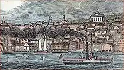 Woodcut of Newburgh in 1842, when the Dutch Reformed Church, had its original dome and lantern