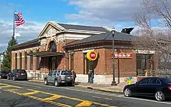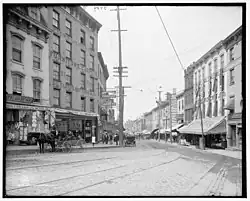Newburgh became quite prosperous during the Gilded Age that followed. Newburgh had telephone service in 1879.[7] In 1883 there was a steamboat landing on Second Street. The United States Hotel was on Front Street opposite the landing. Also on Front Street near the landing was the Union Depot.[11] In 1883, the West Shore Railroad inaugurated service to the Pennsylvania Railroad Depot at Jersey City[12] and by 1886 was traveling to Weehawken Terminal, where passengers transferred to ferries to Manhattan.[13]