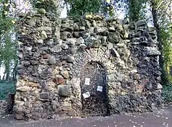 The estate is notable for the remains of a 'Shell Grotto'.[31] The fashion for such grottoes was at its height in the later 18th century, popularised by precedents at Stourhead estate, in Wiltshire c.1748, and Pope's villa Grotto in Twickenham, c.1725. The Newhailes Grotto was Commissioned by Lord Hailes, built c.1785, as a pleasure ground to the north of the house. There are the remains of square plan rocaille grotto set in woodlands, currently roofless. The interior formerly lined with decorative sea shell patterns, mounted on timber panels, of which only remnants remain in woodland around.
