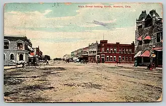 In 1901, Newkirk suffered a major reversal when nearly a whole block of its thriving downtown burned. The wooden buildings that burned were mostly replaced with stone buildings from the distinctive yellow limestone quarried four miles east of Newkirk. "Imposing stone buildings began to give dignity and permanence to the dusty streets, while wood-frame homes gradually replaced the 'proving-up' homes of the Run. Young Elms, Cottonwoods, shrubs, and flowers began to change the once treeless prairies into shaded garden spots."[11] Newkirk's business district was placed on the National Register as a historic district in 1984.[12]