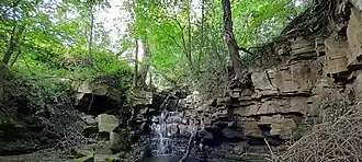 Veering south west off Fine Lane and past Sisterson Farm, is a footpath running parallel to then crossing a stream known as Small Burn.[5] Two waterfalls can be found on this stream, collectively referred to on Google Maps as Small Burn Falls (nicknamed Sisterson Falls by some, after the nearby farm. Not owned by Farm.). The first is hidden in the trees at the top of a gorge on the edge of Newlands (note this can be dangerous to access when the stream is in flood). The second can be found a further 150 m further on where the footpath crosses Small Burn over a stone bridge.