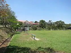 Changes to the school grounds have also occurred since WWII. These included the construction of stairs to the oval (the current concrete stairs date from the 1960s, replacing an earlier set).[95][96] Additions made to the Newmarket School Reserve when it increased to 8 acres (3.2 ha) 13.1 perches (330 m2) in 1963–4 included the extension of the playing field to its west, as part of works relating to the opening of the Newmarket State High school. Much of the bank excavated during the 1930s along the southern edge of the oval was removed or altered at this time.[97][98] New tennis courts and a shelter shed were completed between 2002 and 2004.[99][93] More recent buildings added to the school grounds are located along the Banks Street boundary and around former netball courts in the southeast corner. In the area in front of Block A's entrance portico garden beds have been created, early paths have been paved or laid with bitumen, and several memorials have been established.[94][1]