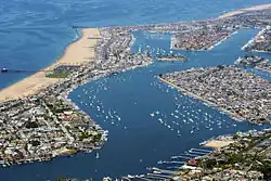 Newport Bay, in Southern California, United States, is the lower bay formed along the coast below the Upper Newport Bay, after the end of the Pleistocene. It was formed by sand, brought by ocean currents from the Santa Ana River and other rivers to the north, which constructed an offshore beach, now called the Balboa Peninsula.[1] The bay was named by the Spanish Bolsa de Gengar in the 18th century, to refer to the nearby Tongva and Acjachemen village of Genga.[2] An estuary of the Santa Ana River in the late 19th century, it was dredged to form Newport Harbor, the harbor of Newport Beach.[1][3][4]