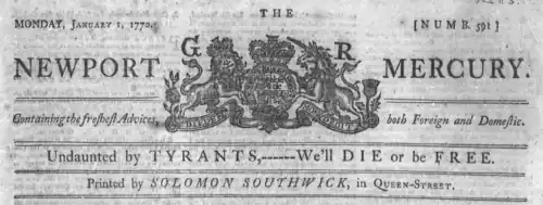 During the war, Southwick set up another press in Attleboro, Massachusetts, and from there published The Newport Mercury until his return to Newport in 1780, printing on "Queen Street, near the Middle of the Parade." According to publisher Isaiah Thomas, "Southwick continued the Mercury on the respectable ground on which it was placed by Hall; and, during the contest for the independence of our country, he conducted it with firmness and patriotic zeal."[4]