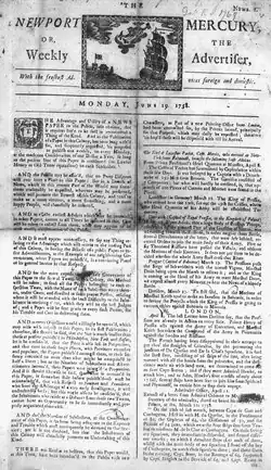 The Mercury was published regularly up to the time the British Army occupied Newport in December 1776, when the press and types were buried. After the British evacuated Newport in November 1779, the Mercury was issued again.[4]
