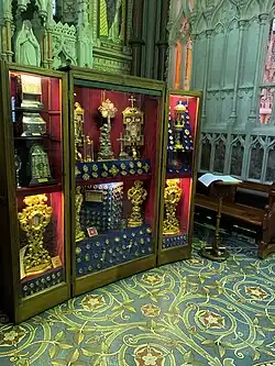 The Cathedral Reliquary contains over 300 Relics of the Saints. It was described in "The Christian Family Magazine" as "Irelands Most Precious Reliquary".[9] This shrine is exposed for veneration each year during the octave of the Feast of All Saints. In this collection may be seen a relic of the True Cross, a piece of the Veil of the Most Blessed Virgin Mary, pieces from the instruments of Christ's Passion (Arma Christi) two sets of relics belonging to the Apostles and relics of several Irish Saints including St. Patrick, St. Brigid, St. Columkille, St. Columbanus, St. Virgilius, St. Gall, St. Laurence O'Toole, St. Oliver Plunket. Many other Saints of the Catholic Church are also included - Popes, Confessors, Martyrs, Pontiffs, Doctors and Holy Women. Some of these are shown in artistic mountings, others are enclosed in wrought cases or miniature replicas of famous historic shrines. All were collected by Bishop Mulhern who arranged the setting and layout of the reliquary. The folding oak casement of the shrine was designed and executed by Mr J.H. McAteer, Newry. Together with all the relics enclosed, it was presented to the Cathedral in 1925 by Bishop Mulhern on the occasion of its Consecration.[4]