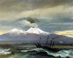 According to the art historian Vera Chaikovskaya, the four men depicted in the painting "hardly resemble Russian travelers" in their appearance: their postures are too loose, their clothes resemble home dresses, one holds a small dog in his arms, on the head of another "a funny straw hat with a tassel"[53] (Mikhail Lobanov called it 'kippah',[13][56] and Alexei Novitsky — 'nightcap').[36] The newspaper readers are standing in front of a dark wall,[53] in the opening of which (in the right part of the picture) one can see in the background a smoking volcano — Vesuvius, which was considered by Kiprensky's contemporaries to be a symbol of revolution. This detail gives an idea of the artist's social sympathies.[58] In the upper left corner of the wall is the author's date — 1831.[1]