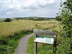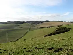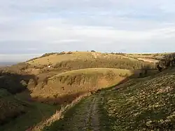 North, East and West Hill all surround Saddlecombe. North Hill (TQ 270 120) has two prominent Bronze Age barrows in which, despite being previously robbed, archeologists found pottery vessels, a skeleton and a dagger.[12][5] The barrows themselves sit at the top of the hill in an island of old acid grassland. There are treasures still there in the form of betony, eggs and bacon, tormentil and knapweed, and in autumn (in a good year) a real cornucopia of colourful waxcaps, coral fungi and earth tongues, including several old pasture indicator species. West Hill has some pristine old chalk grassland with an up-slope fringe of scrub and some rare dyer’s greenweed.
