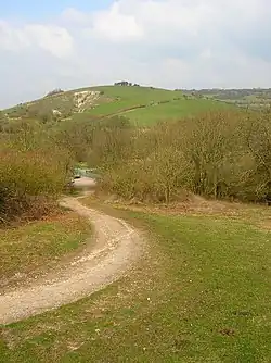 Summers Down (TQ 267 110) is a bushy acid grassland with lots of sheltered places and a good view of the Poynings Gap. The place was a pagan Saxon cemetery, the site of an old windmill, and a small cross dyke,[6] but they are difficult to make out. South of the road, the National Trust car park has three Bronze Age bowl barrows still upstanding, both with their tops dug out by treasure seekers of the past.[6]