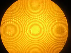 A similar analysis for illumination of the device from below instead of from above shows that in this case the central portion of the pattern is bright, not dark. When the light is not monochromatic, the radial position of the fringe pattern has a "rainbow" appearance.