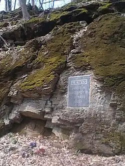In 1909, three local children were lost in the underground limestone caverns underneath the town of Newton. An entrance to these caves (now sealed) was located in the woods near the cemetery. Currently, a marker bearing the names of these three children, James W., Margaret, and J. Howard Lewis, is mounted in the face of the rock-outcropping approximately fifty-yards into the woods on the cemetery property. The magazine Weird NJ recounts that the daughter, Margaret found her way into the cave and got lost. Her two brothers went in to find her and also got lost.[7] This tale is merely folklore as the family of James W. Lewis, his wife Margaret Lewis and their adoptive son James Howard Lewis can be found in the Newton New Jersey 1895 census, where James W. and Margaret Lewis are without a doubt listed as adults. Further research reveals a marriage record for them in 1859, as well as J. Howard Lewis death records and obituary in 1899 and Margaret's 1906 death and obituary. Newton Cemetery is largely re-interred plots, Margaret and J. Howard were initially buried in Deckertown Union Cemetery in Wantage, Sussex, New Jersey and re-interred here by James W. Lewis in 1909. [8][9]