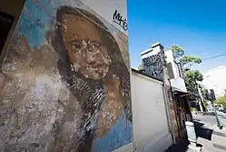Since the 1980s, the area surrounding the Sydney inner west suburb of Newtown, Australia, including the suburbs of Newtown, Enmore, Erskineville, Camperdown, and St Peters, has been known for its wide range of prominent graffiti and street art on walls.[1] The public visual art in the Newtown area consists of a variety of styles and methods of execution, including large-scale painted murals, hand-painted (or sprayed) political slogans, hand-painted figurative designs, spray painted semi-abstract designs (including large-scale and elaborate semi-pictorial) "tags"), and other stylistic developments such as stencil art and street poster art (also known as "wheatpasting"), "Yarn bombing", and sculptural items cast from plaster and other materials.[2]