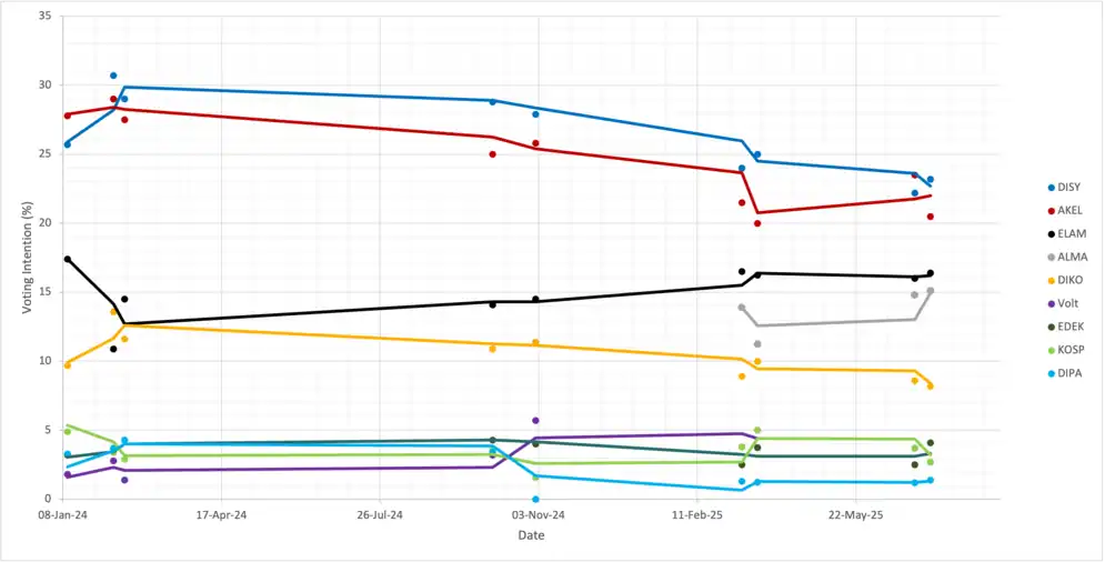 | Date | Polling firm | DISY | AKEL | ELAM | ALMA | DIKO | Volt | EDEK | KOSP | DIPA | EP | APC | Others | Lead |