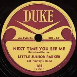 In 1957, Duke Records released "Next Time You See Me" as a single, backed with "My Dolly Bee". It reached number five on Billboard's R&B chart as well as reaching number 74 on its broader Hot 100.[2] The song is included on several Parker compilations, such as Junior's Blues: The Duke Recordings, Vol. 1 (1992).[3]